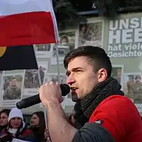 Austrian identitarian leader Martin Sellner at a protest in Graz