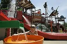 The location of the Soak Zone was originally an island known as Flower Island until part of the surrounding lake was filled in. Under previous names, it was called the H20hhh Zone and later Dr. Hydro's Soak Zone. The area originally consisted of just the pool and bathhouse until slides were first added in 1985. A raft ride, Rafter's Run, was added the next year.[35] The water park has since been expanded to include body slides, inner-tube slides, a slide with foam mats, and many features for children, including a small pool and Captain Kidd's Adventure Galley, a play area added in 2006.[31] The swimming pool was replaced by a heated wave pool in 2011. The addition was the park's single-largest capital improvement.[36] For the 2013 season the park added a lazy river and an expanded beach area.[37]