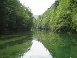 The river basin has an area of 598 square kilometres (231 sq mi).[1] The major tributaries are the Belca, Zala, Cerknica, and Bača from the right and the Nikomlja, Kanošica, and Trebušica from the left. One of the right tributaries is also the Jezernica River, which originates from the Wild Lake (Slovene: Divje jezero). Being only 55 m long, the Jezernica is the shortest river in Slovenia.