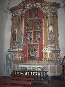 The chancel (early 16th century) with the main altar (from a later date) displays Renaissance features. But the choir stalls were made in different art styles : the right one in Renaissance, the left in Baroque style. The altars in the transept are decorated with gilded sculpturework (talha dourada) framing 16th century panels, probably painted by Flemish artists.