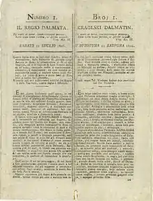 Il Regio Dalmata – Kraglski Dalmatin (also Kraljski Dalmatin) was a bilingual weekly newspaper, written in Italian and Croatian, which was published in Zadar by the French government between 1806 and 1810. It was the first newspaper published in Croatian.[2][3]