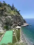 The Miramare gradually became more established and ultimately one of the more popular hotels on the Amalfi Coast. Cinque took to rowing his small fishing boat in the late afternoons to a headland two km south of Positano in the Laurito district that everybody knew as La Punta (The Point), where he dropped his lobster pots. It had a small beach, lush vegetation, and most notably was characterized by a tall cliff that abruptly met the sea. At the top was a small, white-walled fisherman's chapel called San Pietro. Cinque fell in love with it and resolved to buy the land from his brother-in-law, which he accomplished in 1962.[2][1] In 1962 when Cinque purchased the land it was described as "the promontory between Positano and Praiano, that is just a rock with a small 17th century chapel of San Pietro."[3][4] Positano, at the time, was a small fishing village, but it was gradually starting to attract the attention of tourists. Following this purchase, Cinque undertook a gradual expansion of the chapel into an apartment with a garden and terraces, doing his best to avoid disturbing the natural character of the land. His idea was to build a hotel that would blend in with the surrounding landscape.
