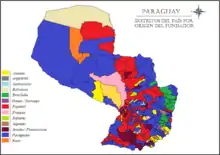 Map of Paraguay indicating the origin of the founders of the different districts in the country by colour.