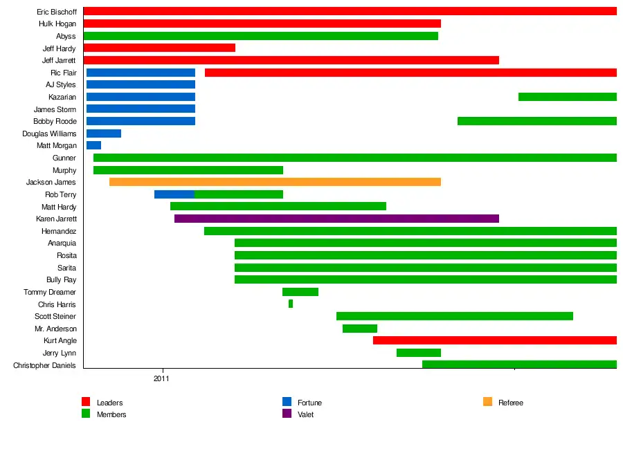 Hulk Hogan and Eric Bischoff debuted in Total Nonstop Action Wrestling (TNA) on the January 4, 2010, live edition of Impact!, where they were introduced as business partners of TNA President Dixie Carter.[2] As faces, Hogan and Bischoff exercised control over the company, and attempted to help the company succeed. In February, Hogan began a storyline where he began mentoring Abyss, presenting him with his Hall of Fame ring. Conversely, Ric Flair had also recently debuted in the company and began to mentor A.J. Styles; the two pairs would begin a feud with each other, and later, Hogan, Abyss and fellow babyfaces Jeff Hardy, Rob Van Dam and Mr. Anderson would feud with Styles and Flair's Fortune stable.[3] This continued until the June 17 edition of Impact!, where Abyss turned heel, attacking both Hardy and Anderson and confronting Hogan.[4] Abyss would later go on to explain his actions by claiming that he was being controlled by an entity referred to only as "they"; and that "they" would be coming to TNA soon.[5]