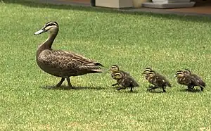 The best-known form of imprinting is filial imprinting, in which a young animal narrows its social preferences to an object (typically a parent) as a result of exposure to that object. It is most obvious in nidifugous birds, which imprint on their parents and then follow them around.[1] It was first reported in domestic chickens, by Sir Thomas More in 1516 as described in his treatise Utopia, 350 years earlier than by the 19th-century amateur biologist Douglas Spalding. It was rediscovered by the early ethologist Oskar Heinroth, and studied extensively and popularized by his disciple Konrad Lorenz working with greylag geese.[2]