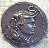 Coin depicting the Greco-Bactrian king Euthydemus 230–200 BC. The Greek inscription reads: ΒΑΣΙΛΕΩΣ ΕΥΘΥΔΗΜΟΥ – "(of) King Euthydemus".