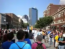 The first known Pride week in Indianapolis was celebrated in 1976 with the support of Metropolitan Community Church and Gay Peoples Union.[4] However, the first Indy Pride, Inc., sponsored event began in 1996 as a week-long celebration of events. Jeffrey Cleary and Bill McKinley served as Co-Chairs for the city's first ever pride week.[5] The celebration held 10 events in seven days, culminating with a pride fair on the downtown Indy Canal.[6] In 2011, the festival broke records by attracting a record estimate 70,000 attendees.[1] In 2012, the week of events opened with the new "Rainbow 5k Run/Walk".[7] The festival saw the addition of a 2nd stage, as well as an expansion in family-friendly entertainment.[8] Attendance grew every year in the following decade until 2020 and 2021 when the event was not held in person due to the COVID-19 pandemic.[9]
