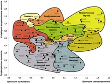 The Inglehart–Welzel cultural map of the world is a scatter plot created by political scientists Ronald Inglehart and Christian Welzel based on the World Values Survey and European Values Survey.[1] It depicts closely linked cultural values that vary between societies in two predominant dimensions: traditional versus secular-rational values on the vertical y-axis and survival versus self-expression values on the horizontal x-axis. Moving upward on this map reflects the shift from traditional values to secular-rational ones and moving rightward reflects the shift from survival values to self-expression values.