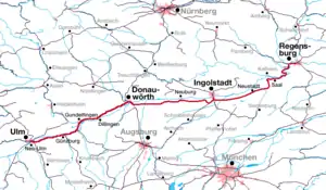 The Ingolstadt–Neuoffingen railway is a single-track, electrified mainline railway in Bavaria, Germany. It runs in the Danube valley from Ingolstadt via Neuburg an der Donau, Donauwörth and Dillingen an der Donau to Neuoffingen, where it joins the Augsburg–Ulm railway. The Ingolstadt–Neuoffingen railway and the Regensburg–Ingolstadt railway together form the Bavarian Danube Valley Railway (Donautalbahn).