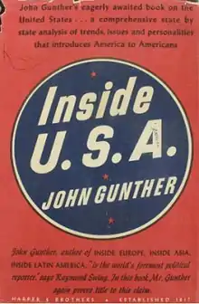 Inside U.S.A. is a nonfiction book by John Gunther, first published in 1947 and one of that year's best-selling nonfiction books in the United States. It describes the author's observations during 13 months of travel through the then-48 U.S. states beginning in November 1944.