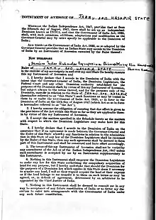 The Jammu and Kashmir Instrument of Accession is a legal document executed by Maharaja Hari Singh, ruler of the princely state of Jammu and Kashmir, on 26 October 1947.[1][2]