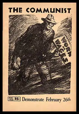 The Communist Party USA (CPUSA) prepared for the March 6 actions with agitational meetings and leaflets, over 1 million of which were circulated in anticipation of the event.[5] The party made use of two primary mobilizing slogans to motivate participation and to generate enthusiasm for the event: "Work or Wages!" and "Don't Starve – Fight!"[6] The demonstrations were to be conducted under the auspices of the party's trade union adjunct, the Trade Union Unity League (TUUL).[5]