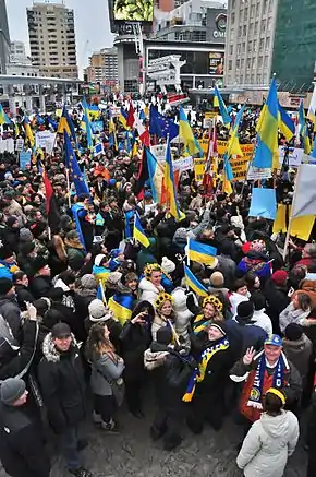 Smaller protests or Euromaidans were also organized starting on 24 November by Ukrainians and local citizens of Ukrainian descent in countries such as Poland, the United Kingdom, Germany, France, Italy, Sweden, Austria, the Czech Republic, Bulgaria, the United States and Canada.[91] More than one hundred Ukrainians had gathered in Prague to support Euromaidan in Ukraine.[92] Conspicuously absent were non Ukrainian radical leftist organized demonstrations supporting Euromaidan.[93]