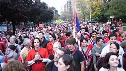 On the same day, about 3,000 refugees, migrant workers and activists staged a march towards the Burmese embassy in Kuala Lumpur and handed a memorandum to minister-counsellor Win Myint, urging the junta to resolve the unrest in Myanmar. The protest was led by All Burma Democratic Force, followed by a range of other human rights organisations.[17] Another round of peaceful demonstration was held by 2,000 Myanmars affront the Burmese embassy (alongside the Russian and Chinese embassies) on the morning of October 4.[18]