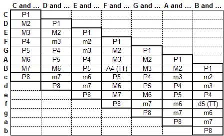 The augmented fourth (A4) and the diminished fifth (d5) are the only augmented and diminished intervals that appear in diatonic scales[lower-alpha 2] (see table).