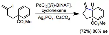 Asymmetric IMHR may establish tertiary or quaternary stereocenters. BINAP is the most commonly chiral ligand used in this context. An interesting application of IMHR is group-selective desymmetrization (enantiotopic group selection), in which the chiral palladium aryl intermediate undergoes insertion predominantly with one of the enantiotopic double bonds.[17]