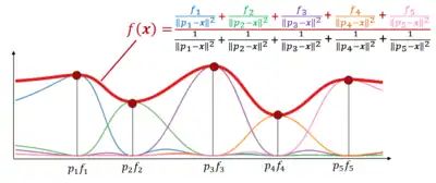 is a simple IDW weighting function, as defined by Shepard,[3] x denotes an interpolated (arbitrary) point, xi is an interpolating (known) point, is a given distance (metric operator) from the known point xi to the unknown point x, N is the total number of known points used in interpolation and is a positive real number, called the power parameter.