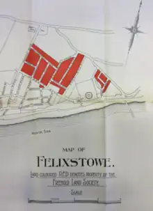 Ipswich and Suffolk Freehold Land Society (FLS) was founded in 1849 as part of the "forty-shilling freeholders movement" which developed across England. Its aim was to enable "the ordinary man" to obtain sufficient property to meet the requirements needed to gain the vote.[1] The movement had been started by James Taylor of Birmingham. On Saturday 1 December 1849 the first meeting of the society was advertised in the Suffolk Chronicle.[2] Richard Dykes Alexander, the head of the Alexander banking family, was the first president.[3]