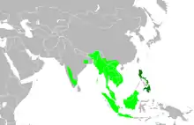 The Asian fairy-bluebird has a discontinuous distribution from India to Java and Vietnam. In India the species is present in the southwest of the country and in the northeast. From Burma it has a continuous distribution (in suitable habitat) throughout most of Southeast Asia, and down into Borneo and Sumatra, as well as on the Andaman Islands. The species is rare in Sri Lanka. The Philippine fairy-bluebird is found on Luzon, Polillo, Leyte, Samar, Mindanao, Dinagat and Basilan. The Palawan fairy-bluebird is endemic to the island of Palawan.[2]