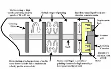 The ground product is separated from the grinding medium at the discharge end of the mill. This is achieved without using screens by using a patented product separator that consists of a rotor and a displacement body (see Figure 2 and Figure 4).[10] The relatively short distance between the last disk results in a centrifugal action that forces coarse particles towards the mill shell, from where they flow back towards the feed end.[10] This action retains the grinding medium within the mill.[10]