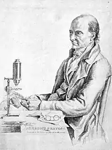 Prévost was born in Geneva to Jean-Jacques Prévost and Marie-Élisabeth Henri. A cousin was the ophthalmologist Pierre Prévost.[1] Little is known of his early life but he chose science to a career in business after apprenticing in a grocery. He became interested in science after reading the work of the astronomer Duc-la-Chapelle. In 1777, he became a private tutor to the sons of Delmas in Montauban. He founded a society for science in Montauban. In 1807 he identified bunt on wheat as being caused by fungi and suggested that it could be controlled by treating the seeds with copper sulphate. He published his findings in Mémoire sur la cause immédiate de la carie oú charbon desblés, et de plusieurs autres maladies des plantes, et sur les préservatifs de la carie (Paris, 1807). He made microscope observations on the germination of the spores of the fungus which was later called Tilletia caries.[2] He determined that the spores needed humidity but dismissed the idea that the disease itself was caused by climatic factors as was then believed. His work was however dismissed by scientists in higher positions such as Henri-Alexandre Tessier. Despite this the farmers around Switzerland followed the method of seed treatment and found it effective.[3] In 1810 he became professor of philosophy at the Faculte de Theologie Protestante, a position he obtained with a recommendation of Marc-Auguste Pictet who wrote to Georges Cuvier. In 1812 he received a doctorate in theology from the Toulouse Academy.[4] Prevost became ill between 1803 and 1804 and died in 1819 in Montauban following "ataxic fever".[5][4]