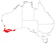This isopogon grows in woodland with a heathy understorey, in scattered population from near Perth to Albany and Mount Manypeaks, in the south-west of Western Australia.[2][3]