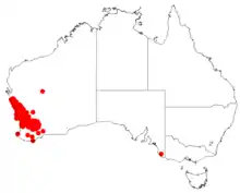 Spreading coneflower grows in shrubland and heath and is widely distributed between the Murchison River and Lake Grace in the Avon Wheatbelt, Geraldton Sandplains, Jarrah Forest, Mallee and Swan Coastal Plain biogeographic regions in the south-west of Western Australia.[2][3]