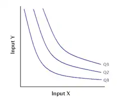 An isoquant map where production output Q3 > Q2 > Q1. Typically inputs X and Y would refer to labor and capital respectively. More of input X, input Y, or both is required to move from isoquant Q1 to Q2, or from Q2 to Q3.