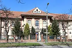 Another major problem was securing its own premises. For this purpose, steps were taken at the town hall to purchase a plot of land of about 8,000 m2, a block currently located between Constantin Diaconovici Loga Boulevard, 20 December 1989 Street, Mihai Eminescu Boulevard and Patriarch Miron Cristea Street. There, on the north side, towards Mihai Eminescu Boulevard, the high school building was built, financed from offertories and donations of the Jewish community. The architects were Jaques Klein and Gideon Neubauer.[7] Initially, in the form put into operation in 1923, the building had a single level and had 16 classrooms, one for gymnastics, one for drawing, a physics and chemistry laboratory, a 1,600-volume library, a chancellery and a principal's office. In 1928 the building was raised. On the ground floor there was a girls' gymnasium and a boys' theoretical high school, and on the first floor there was a boys' commercial high school. Also in 1928, on the south side, towards Constantin Diaconovici Loga Boulevard, László Székely built the boarding school building. The building is made in an eclectic style, with elements of Secession and classicism. The boarding school was planned to accommodate 60 students.[5][8][9]
