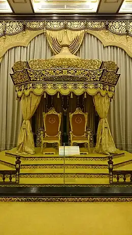The Singgahsana or throne in the Balai Rong Seri is the symbol of supremacy of the country. The King will sit on the Singahsana with honour and sovereignty. It is thus for the same purpose that the Singgahsana at the Balai Rong Seri of Istana Negara has been artistically and elaborately designed to reflect a structure that embodies traditional Malay values of the highest quality, befitting the official use of His Majesty The Yang di-Pertuan Agong in carrying out his duties as the Head of State. The Singgahsana is the seat of His Majesty The Yang di-Pertuan Agong and Her Majesty The Raja Permaisuri Agong during the Installation Ceremony. The structure is decorated with carvings that incorporate a combination of motifs, including that of the hibiscus, the national flower of Malaysia. The gold colour of the carved motifs serves to highlight the supreme feature of the Singgahsana. The overall design of the Singgahsana is of an upright structure to symbolise that all human beings ought to constantly remember and bow their Creator, that is, Allah the Almighty. The carved pillars symbolise the inspiration, endeavour and inspiration of the multiracial people of the country to achieve national unity, peace and prosperity. The inscription of the word Allah, Muhammad and a verse of the holy Quran signify the position of Islam as the official religion of the Federation. The verse of the Holy Quran means: Say ye (0) Muhammad: 0 Allah Who holds the power of governing, it is You who gives the power to govern to whom You wish and it is You who withdraws the power to govern from whom You wish (Ali-Imran:26).