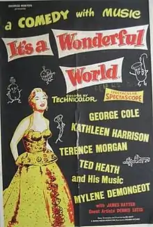 It's a Wonderful World is a 1956 British musical film directed by Val Guest and starring Terence Morgan, George Cole, Mylène Demongeot (in her first English-language film and listed in the credits as Mylène Nicole) and Kathleen Harrison.[1] It also features Dennis Lotis, a popular singer at the time. It was made at Shepperton Studios.[2] Songs include: "Rosanne", "When You Came Along", "Girls! Girls! Girls!" (Ted Heath, Moira Heath), "A Few Kisses Ago" (Robert Farnon, Val Guest), and "The Hawaiian War Chant" (Ted Heath).[3]