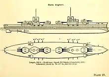 Right elevation and plan of Dante Alighieri from Brassey's Naval Annual 1923; the shaded areas are armored