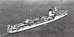 On 30 November 1942 Lupo, in company with three sister ships under command of Corvette Captain Giuseppe Folli, left Naples to escort the merchant ships Veloce and Chisone to Tripoli. A third ship, the tanker Devoli, detached herself from the convoy to Trapani. On 2 December the convoy was attacked by aircraft from Malta; Veloce was hit twice and set on fire. While the other ships continued, Lupo stood by the sinking Veloce to render assistance to the survivors. The two vessels were eventually found south of the Kerkennah bank by a force of four destroyers which were tracing the convoy, led by HMS Jervis. Lupo was quickly overwhelmed by gunfire from the destroyers; Lupo sank in a few minutes, and the blazing wreck of Veloce followed shortly after. Aretusa, aware of the destroyers' attack, shepherded Chisone to Tripoli, while Ardente headed to the wreck site at dawn. She rescued 29 men from a crew of 164 officers and ratings. Captain Folli was lost with his ship.[13][14]