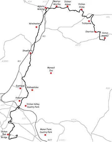 The northern part of the path is within the South Downs National Park and follows the valley of the River Itchen from close to its source at Hinton Ampner.[1] The route passes the springs at the head of the river, before running through New Cheriton, Cheriton. At Tichborne, after touching the edge of New Alresford, the path cuts the corner to Ovington. The river is crossed several times, to Itchen Stoke, Avington and Itchen Abbas. From here the path stays on the right bank to Martyr Worthy.