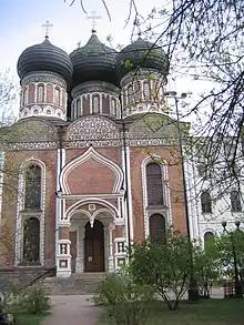 The Kremlin in Izmaylovo is a unique center of culture and entertainment, based at the famous Izmaylovo Vernissage. It is built in a architecture style of Old Muscovite Russia which consists of colorful ornament and wooden architecture in the Russian style. It is an imitation of Moscow based on sketches from the 14th-17th centuries.[5] It is supposed to depict many elements of Old Russian architecture as it looked like in pre-Petrine times. It is also inspired by drawings of Russian fairy tales.[6] This complex is used for civil weddings as it has a wedding palace, a restaurant and bars. However, it is also used as an amusement park/open-air museum for children on the theme of 'Old Russia'. There is a reconstruction of a wooden Russian church that used to dot the Russian countryside before the Russian Revolution but it is not used for weddings. There is also a big market that sells souvenirs amongst other things.