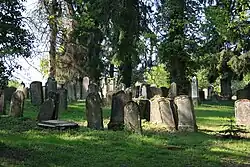 The graves are arranged in north–south direction, but it's not known why the orientation differs from those in other Jewish cemeteries. Men and women were buried in separate rows. Overall, more than 2,700 people are buried in the cemetery. In the oldest part of the cemetery, right next to the road, the grave stones are uniformly, carried out in the basic form of traditional steles. Most were made of the local sandstone, those of the wealthier families from shell limestone. From the mid-19th century, marble was increasingly used, and in addition to the usual Hebrew grave inscriptions also in German with Latin letters. Increasingly, the grave stones were made in the Neoclassical style and neo-Gothic shapes, also broken pillars for young deceased and obelisks were used. Since the mid-1940s, according to the spirit of the age, simple and uniform grave stone were used again. The inscriptions were also restricted to the bare minimum and carried out partly in Hebrew.[2]