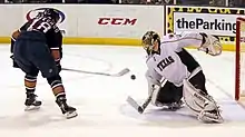 Campbell makes a save against Jonathan Cheechoo while playing with the Texas Stars, February 2013