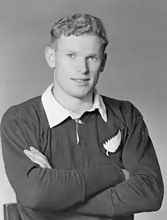 John Wallace Kelly (7 December 1926 – 29 April 2002) was a New Zealand rugby union player. His preferred position was fullback,[1] but he also appeared on the wing or at centre.[2] A fine goal-kicker,[1] Kelly represented Canterbury and Auckland at a provincial level.[2] He first played for the New Zealand national side, the All Blacks, in 1949, playing in the two test matches against the Touring Australian team.[2] He was not selected to play for New Zealand again until the 1953–54 tour of the British Isles, France and North America on which he played in 14 of the 36 games, but he was unable to displace Bob Scott as the first-choice fullback for the test matches.[2] In all, Kelly scored 86 points for the All Blacks in his 16 appearances.[2]