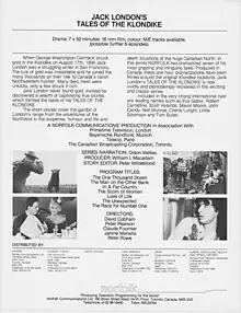 Jack London's Tales of the Klondike is a Canadian produced television drama miniseries which was produced by William Macadam's Norfolk Communications and aired on CBC Television in 1981 and in the UK, Germany, France and other countries around the world as a Norfolk production produced by William I. Macadam [1]