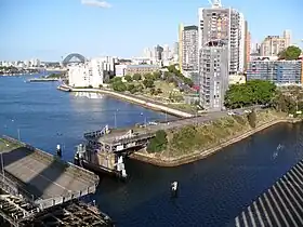 Jacksons Landing with the old Glebe Island Bridge in foreground, viewed from Anzac Bridge