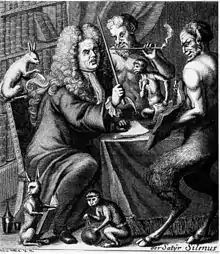 At sessions of the Tobacco Cabinet, court scholars would be brought in to give expert advice on some topic, and a discussion would follow. Often, the excessive alcohol consumption meant that these debates ended in physical fights for the amusement of College members. At these sessions Gundling was particularly singled out for humiliation.[5] In February 1714, he was required to deliver a lecture to assembled guests offering arguments for and against the existence of ghosts, while being made to drink heavily. After his lecture he was escorted by two Grenadier Guards back to his room, where he screamed with terror at the sight of a figure moving around covered in a sheet.[6] On another occasion, while he was drunk, his official Chamberlain's key was cut off his coat, and, in punishment for 'losing' it, he was made to wear a large wooden Chamberlain's key a yard long around his neck;[7] He was invited to dinner and conveyed in a sedan chair from which the bottom fell out while it was moving, forcing him to run to keep up with the bearers, who paid no heed to his cries. A monkey, dressed as Gundling, was introduced to him as his own son, and he was compelled to embrace and kiss it. One night, in the middle of winter, when he was making his way home over the castle drawbridge, he was seized by four burly Grenadier Guards and dropped repeatedly onto the frozen moat below until his weight broke the ice, and he was ridiculed from above as he struggled in agony. Then the king left two young bears in his bedroom to terrify him. He frequently returned home to find his doorway bricked up, and on occasion the quiet of his study was shattered with firecrackers.[8] In 1716 Gundling sought to escape his misery by fleeing to his brother Nicholas Jerome Gundlingius, professor and scholar in Halle, but he was brought back. Unauthorized departure from court was considered to be desertion.