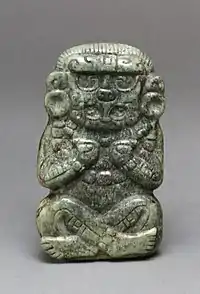Elite Mayans wore jade pendants that depicted "mirror gods" associated with rulership in Mesoamerica.[9] Mirror divination was a part of spiritual practice in Mayan culture, and the Mayan sun god, Kinich Ahau, was often depicted in jade and other materials with a mirror on his forehead. The reflective quality of highly polished jade connected itself to other mirrored objects, promoting its spiritual importance and aesthetic value to the Maya.[9]