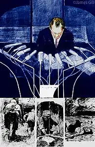 Arising out of a series of anti-war images is the work The Machines. The composition formally joins the media coverage of the United States with the combat conditions in Vietnam.[5]: 209 As a draftsman, Gill earned a reputation for handling contemporary issues through photographic images. The combination of his expressionist art and his graphite pencil went against the trend of this time. William Inge described the dark graphite pencil compositions as follows: "His paintings hold a moment of truth, which is of unfortunate beauty and makes memorable".[6] In this way, Gill goes even further than the often apolitical intent of the early movements of pop art. By addressing his paintings for example with the Vietnam War, his works gain an additional socio-critical dimension which provides a much wider range than the mere and superficially not intended criticism of pop art in consumer society.[7]