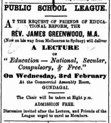 While pastor Greenwood became a prominent campaigner for National, Secular, Compulsory and Free education under the banner of the Public School League.