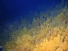 Hydrothermal venting occurs on the southern floor of Healy Caldera[11] and produces metal-rich discharges[58] and iron oxide mounds.[59] There is no evidence for hydrothermal activity at Cotton,[60] and unlike all other Kermadec arc volcanoes there are no known chemosynthetic animal communities at Healy.[61]
