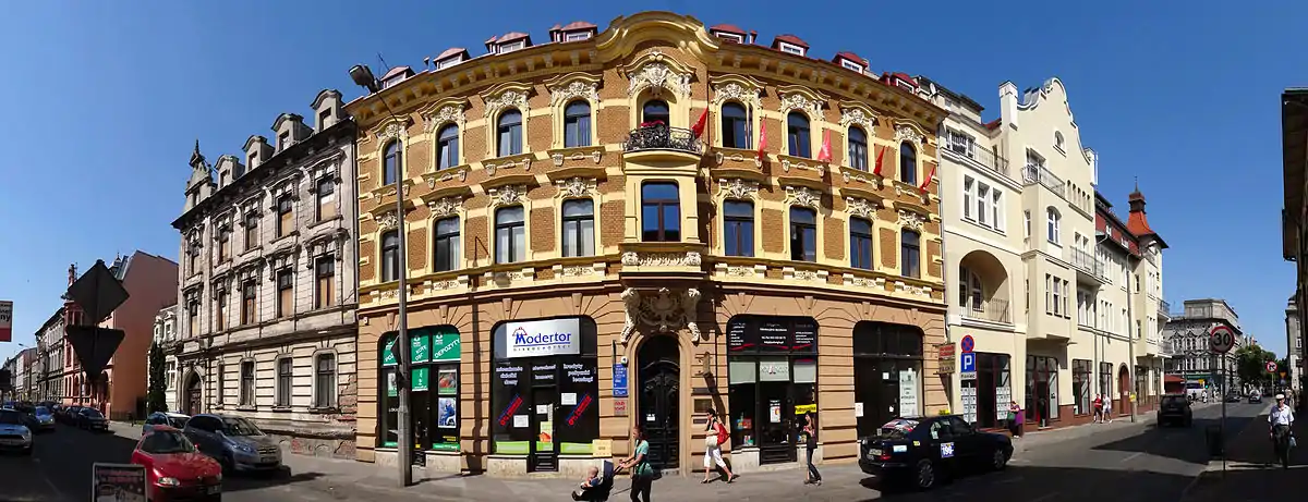 The wings of this corner tenement house draw attention towards the double architectural legacy of the Prussian partition and the period of the Polish People's Republic (PRL).[52] The edifice has been refurbished in the last quarter of 2018.