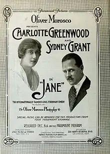 Jane is a 1915 American silent film produced by the Oliver Morosco company and distributed by Paramount Pictures. It is based on a stage play Jane by W.H. Lestocq and Harry Nicholls. Frank Lloyd directed, early in his career, and up-and-coming stage comic Charlotte Greenwood debuts and stars in her first motion picture. This was Lloyd's second directed feature film after several years of making shorts. This film survives in the Library of Congress.[1][2][3][4]