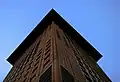 The building was designed by Berlin architect Joachim Ganz and cost approximately 200 million Euros. It was completed in 1996. The strict geometric forms based on the measure of a Japanese tatami mat (0.9 m × 1.8 m) and terra cotta stone cladding correspond to classical Japanese design. Its wide roof reminisces the shape of a Japanese stone lantern.[4] The building outline is square (36.9 m × 36.9 m). Its central core houses nine elevators, two emergency staircases and utility shafts. The facade features large and small square windows housing open plan and single offices respectively.