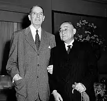 The formation of the Japan lobby dates back to the purge of officials involved in Japanese expansionism during Shōwa statism. Many business monopolies known as Zaibatsu were dissolved during this reform period, their assets being seized by the occupation authorities. A group of journalists and policymakers, subordinated to the Supreme Commander for the Allied Powers, advocated for a policy shift known as Reverse Course.[4][5] The Dodge Plan composed the economic portion of this restructuring, reorganizing the familial Zaibatsu into the shareholder based keiretsu. The most prominent group formed from this advocacy was the American Council on Japan (ACJ).[6] The ACJ was led by Harry Francis Kern, a journalist for the magazine Newsweek.[7] Whereas Kern advocated for a reorientation of Japanese policy towards a more conciliatory pro status-quo position, SCAP head Douglas MacArthur disagreed, and thus was the target of much of Kern's attacks.[7] Kern had the backing of former president Herbert Hoover, John Foster Dulles and several American financiers. The Japanese lobby was headed in the State Department by Joseph Grew, US ambassador to Japan between 1932 and 1941. Grew had substantial ties with the Zaibatsu families and the militarist administration, cultivated during his time as ambassador.[8] Other members of the lobby included Eugene Dooman, who would later become embroiled in a CIA scheme involving the smuggling of tungsten.[9] In addition to American support, much of the Japanese political elite were indebted to the ACJ for their success, most notably including future Prime Minister Nobusuke Kishi, who was allegedly released from Sugamo Prison due to ACJ lobbying.[10] Shigeru Yoshida also maintained a relationship with the ACJ, often going on associate meetings with Kern and other members of the organization.[10]