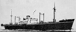 She was laid down at yard number 301 on 9 September 1943 at the Shimonoseki shipyard of Mitsubishi Heavy Industries, Ltd.[2] for the benefit of the Petroleum Trading Co., Ltd. (石油共販株式會社), and given identification number 51179.[3] She was launched on 30 December 1943 and completed 15 March 1944.[3][2] On 29 July 1944, she was chartered by the Imperial Japanese Army to serve as an oil tanker; she was never commissioned and remained in private ownership.[2]